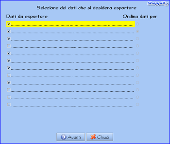 All'avvio della procedura viene visualizzata una maschera per la scelta dei campi da esportare, avendo a disposizione un certo numero di informazioni da selezionare nella colonna "Dati da esportare".