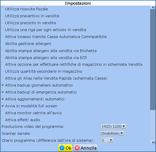 Dalla schermata delle impostazioni sarà possibile impostare le seguenti opzioni del programma:
