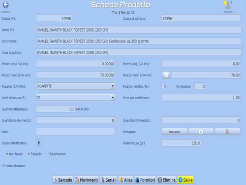 Mediante questa scheda è possibile inserire i dati di un nuovo articolo o apportarne ad uno esistente. Il codice è libero e quando viene creato un nuovo prodotto viene proposto un codice non ancora inserito per agevolare e velocizzare l'inserimento. Se il prodotto che si sta inserendo è fornito di codice a barre, questo va inserito nel campo codice. Il codice di riordino è un secondario codice utilizzato principalmente per effettuare gli ordini verso i fornitori (vedi relativo help cliccando qui). Affinchè un articolo possa essere inserito occorre che siano presenti i campi obbligatori: il codice di vendita ed il nome.
