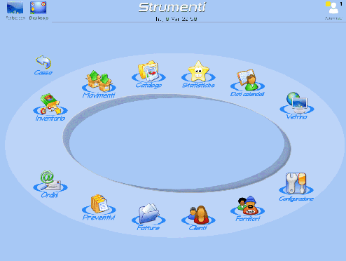 Come abbiamo detto, la schermata della cassa è la più utilizzata durante la giornata lavorativa perchè consente di effettuare le vendite; la schermata degli Strumenti, invece, risulta essere il punto di partenza per tutte le operazioni gestionali. Dalla schermata degli Strumenti è possibile accedere a tutte le funzionalità gestionali, di configurazione ed ausiliarie di DigiShop.